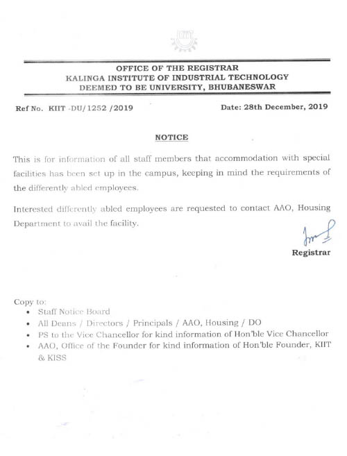 The KIIT University addresses accessibility related issues as per the stipulations of the Persons with Disabilities Act 1995, and ensure that all existing structures as well as future construction projects in their campuses are made disabled friendly. As part of this commitment, access to a wide range of facilities are provided to people for one and all with disabilities. The University has a Policy for Differently-abled people which can be found in the below link