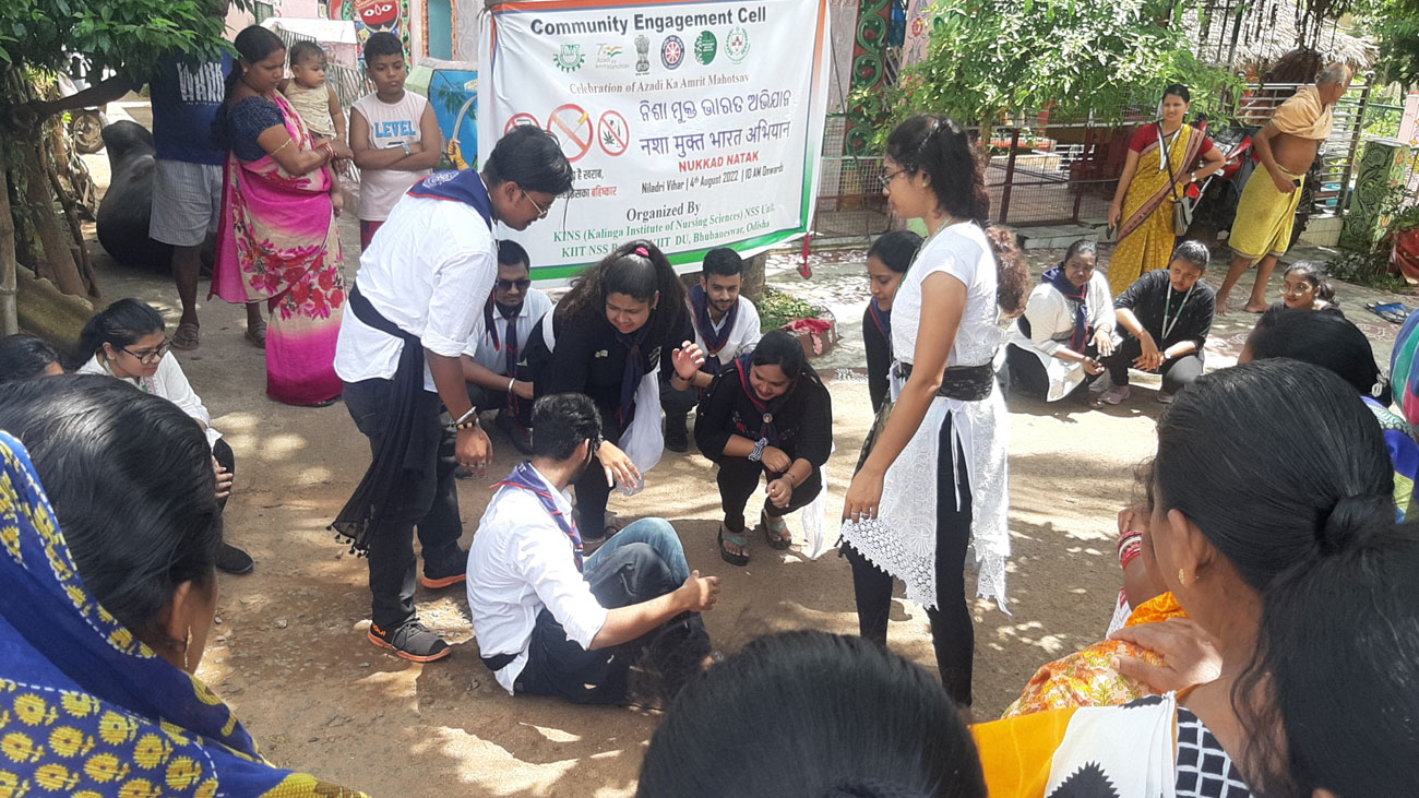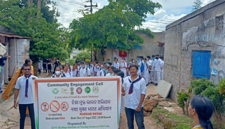 NSS Wings of Kalinga Institute of Nursing Sciences (KINS) organized an awareness program as a part of “Nasha Mukt Bharat Abhiyaan” on 4th August 2022 at Sitanath Nagar, Niladhri Vihar. The program was conducted by NSS volunteers of KINS under the mentorship and guidance of Ms. Daini Sunita and Ms. Anita Panigrahi, NSS Programme Officers. The volunteers took out a rally from Sitanath Nagar to Harekrushna Basti followed by a Nukkad Natak on “Awareness on substance abuse” with anti-tobacco slogans. Food packets were also distributed among people of Sitanath Nagar Basti. It was a pleasant experience for NSS volunteers to interact with people in the community. The program was conducted with the cooperation of Mr. Bajrang Kamudi, Tutor, KINS.