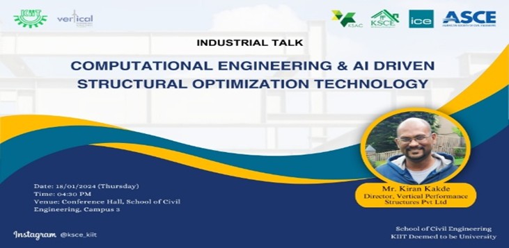 On 18.01.2024, KIIT’s Civil Engineering department hosted an industrial talk on AI-driven structural optimization, led by Mr. Kiran Kakde. The session highlighted green construction practices, patented technologies like Direct Stress Path Mapping, and the future PAAS model. It fostered awareness about sustainability, tech, and modernization in engineering.